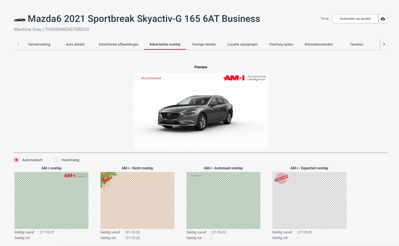 Onder het tandwiel-icoontje vind je als je in het bezit bent van een Dealer-admin gebruikersaccount de functie Overlay onder het Admin tab.