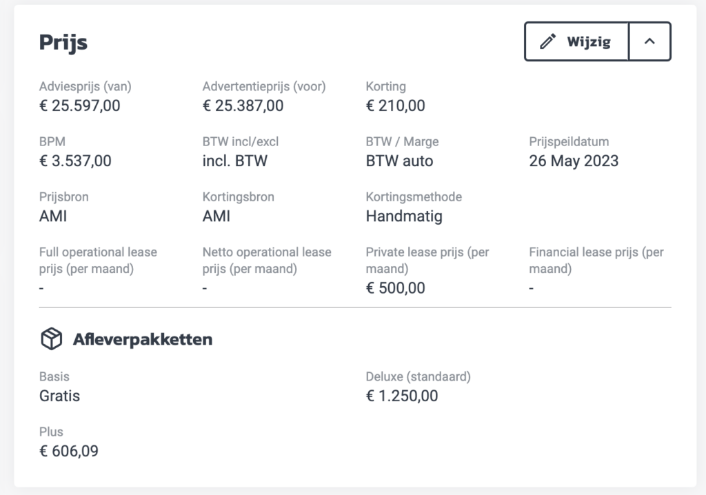 Daarnaast worden afleverpakketten ook weergegeven in het prijsveld van het voertuig onder een aparte sectie, zodat alle bijbehorende kosten en services op één overzichtelijke plaats zichtbaar zijn. Dit zorgt voor transparantie en een duidelijk beeld van welke pakketten aan het voertuig zijn gekoppeld, inclusief de eventuele meerkosten voor de klant.