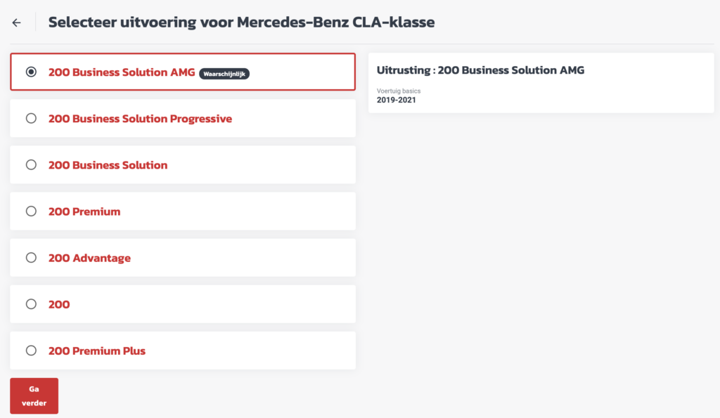 - Automatisch voorstel voor uitvoering: Zodra je een voertuig invoert op basis van het kenteken of chassisnummer, zoekt AM-i de bijbehorende gegevens op en doet een suggestie voor de uitvoering. Dit maakt het proces sneller en nauwkeuriger, omdat je niet handmatig de uitvoering hoeft op te zoeken.