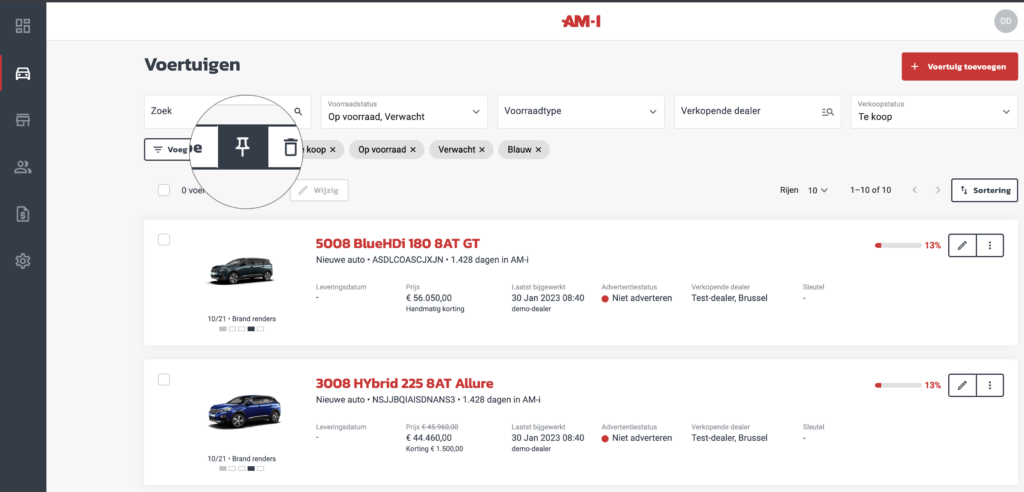 Nadat een gebruiker een zoekopdracht heeft gedaan op basis van enkele filters, dan is het nu mogelijk om de zoekopdracht inclusief de filters op te slaan. Het Punaise icoontje dat beschikbaar komt na een dergelijke zoekopdracht kan gebruikt worden om deze op te slaan.