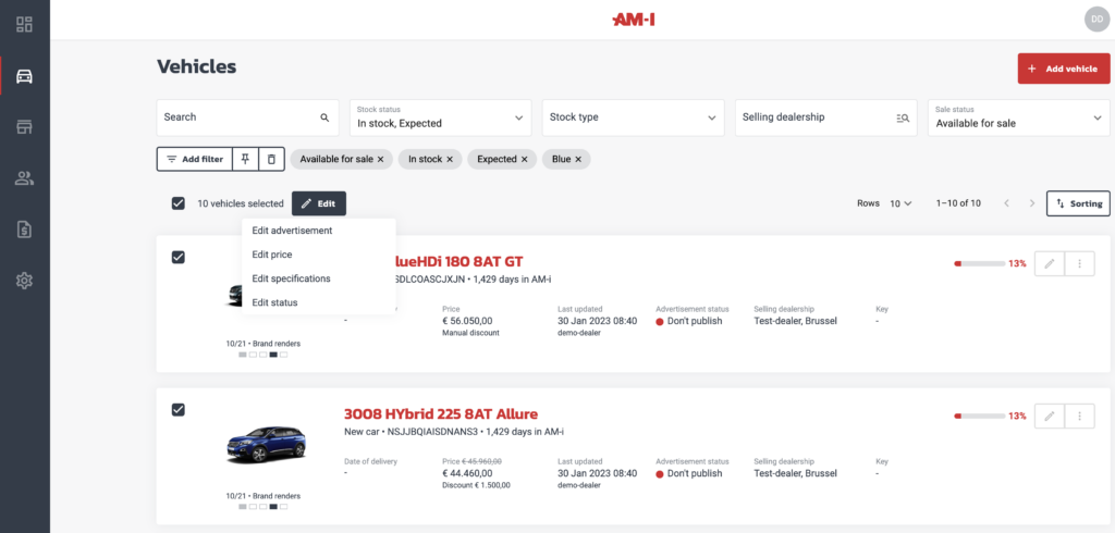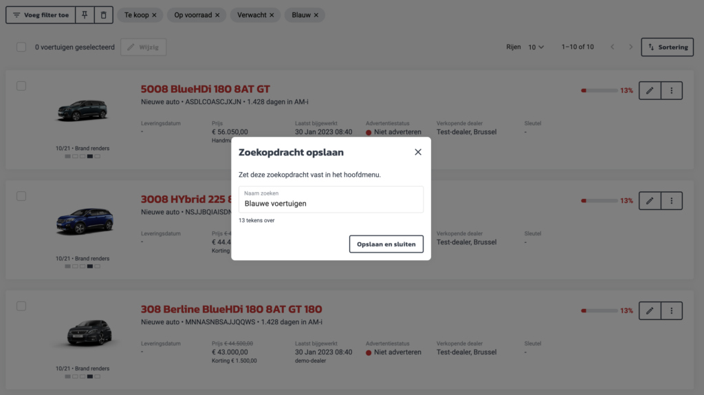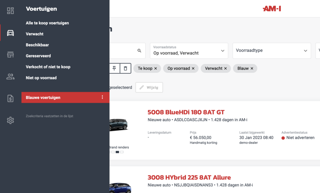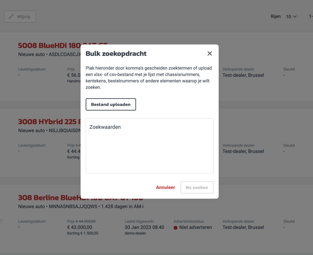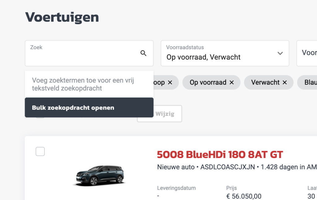 Bulk search is een nieuwe functie die gebruikt kan worden om een selectie voertuigen op te zoeken. Deze selectie kan vervolgens opgeslagen worden zodat deze in een later stadium weer opgezocht kan worden. Denk hier bijvoorbeeld aan het toekennen van kortingen aan een selectie voertuigen.