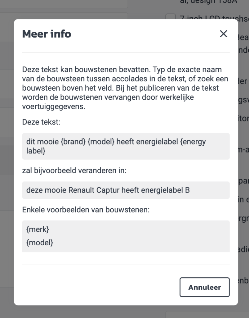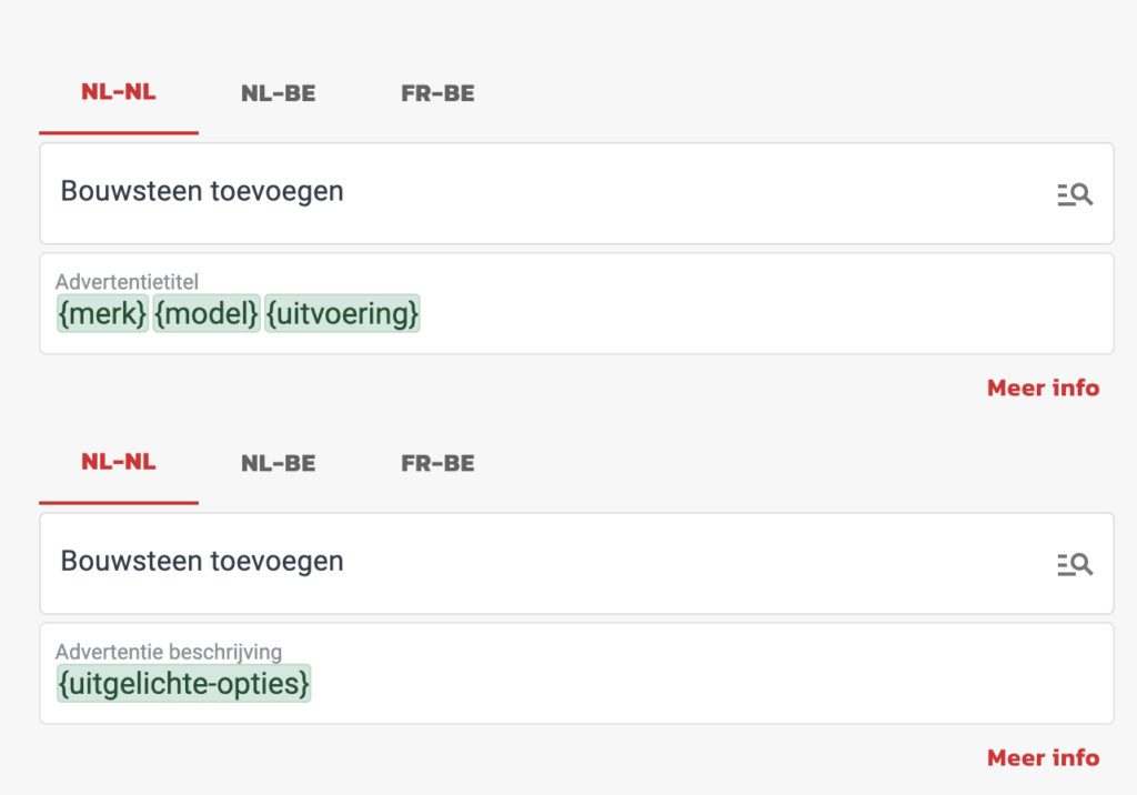 Deze bouwstenen zijn inzetbaar voor zowel de Advertentietitel als Advertentiebeschrijving en zijn instelbaar op dealer niveau en op Carstock niveau. Het grote verschil hier is dat het instellen op dealerniveau van toepassing is op alle voertuigen van deze adverterende dealer en de instelling op Carstock niveau als een uitzondering op voertuigniveau gezien wordt.
