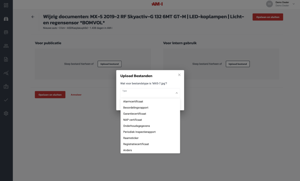 Indien er relevante documenten bij voertuigen opgeslagen moeten worden kan dit in het documenten segment gedaan worden. Het document type is door ons gestandaardiseerd zodat er altijd maar 1 versie aanwezig kan zijn binnen AM-i.