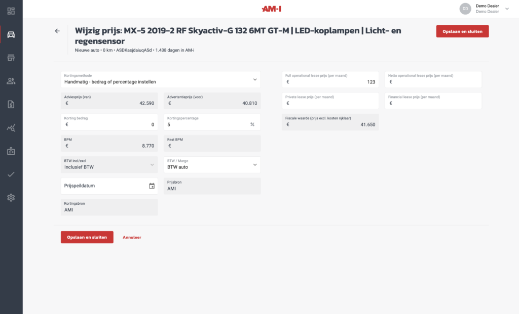 In de toekomst zal het ook mogelijk zijn om een samen met AM-i support ingestelde prijskaart, vanuit het actie menu te genereren. Deze prijskaart kan gebruikt worden bij de voertuigen in de showroom.