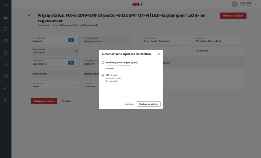 • Reserveer voertuig – past de verkoopstatus van het voertuig aan naar “gereserveerd”, daarnaast krijgt de gebruiker de mogelijkheid een tekst toe te voegen